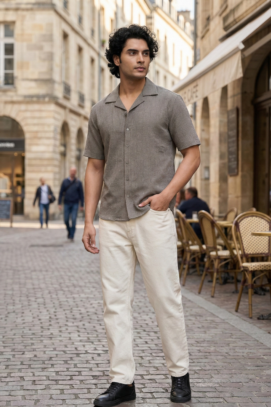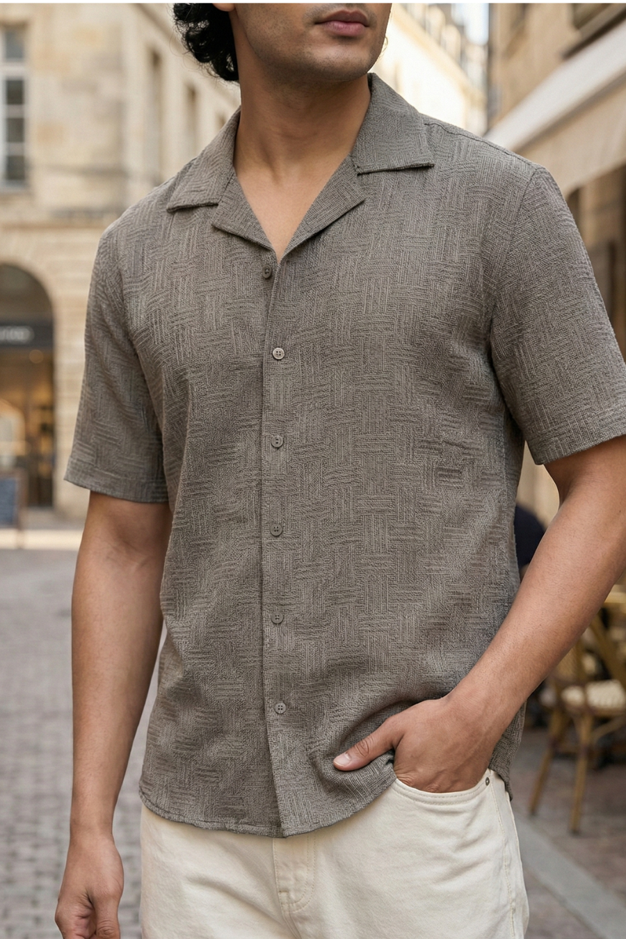 Grey Half Sleeve Textured Shirt with Cuban Collar
