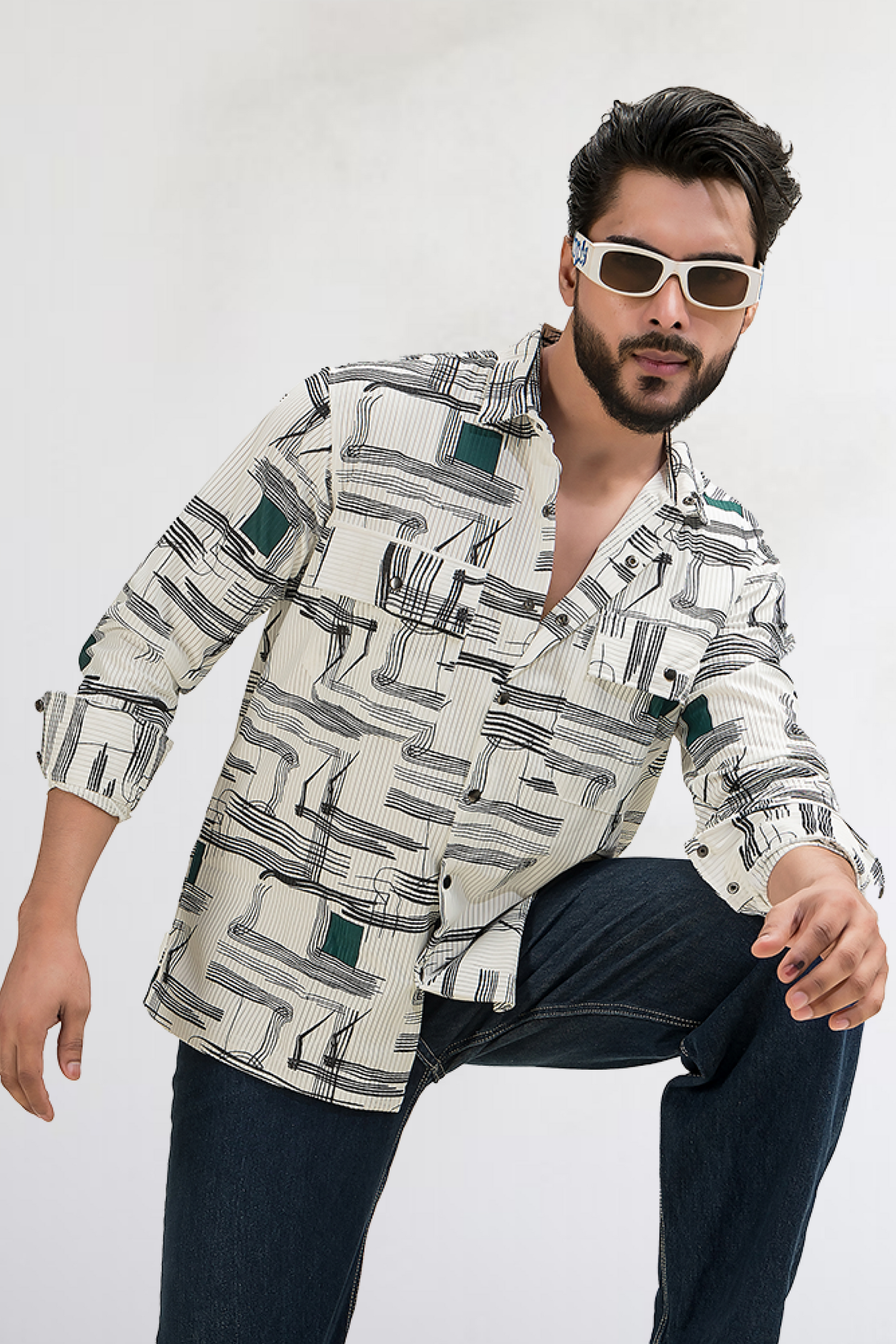 Urban Quill White & Green Printed Corduroy Full Sleeves Shacket