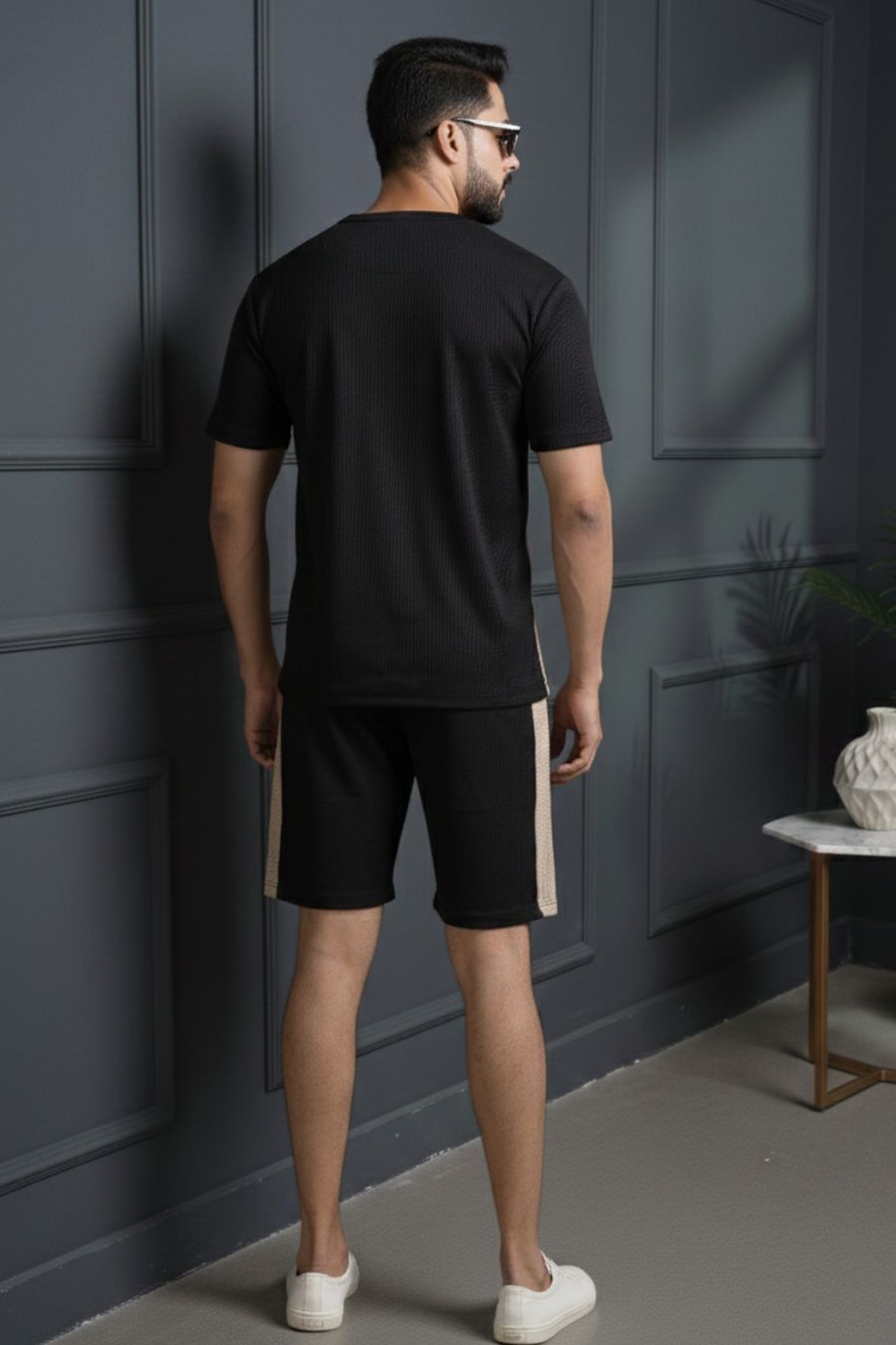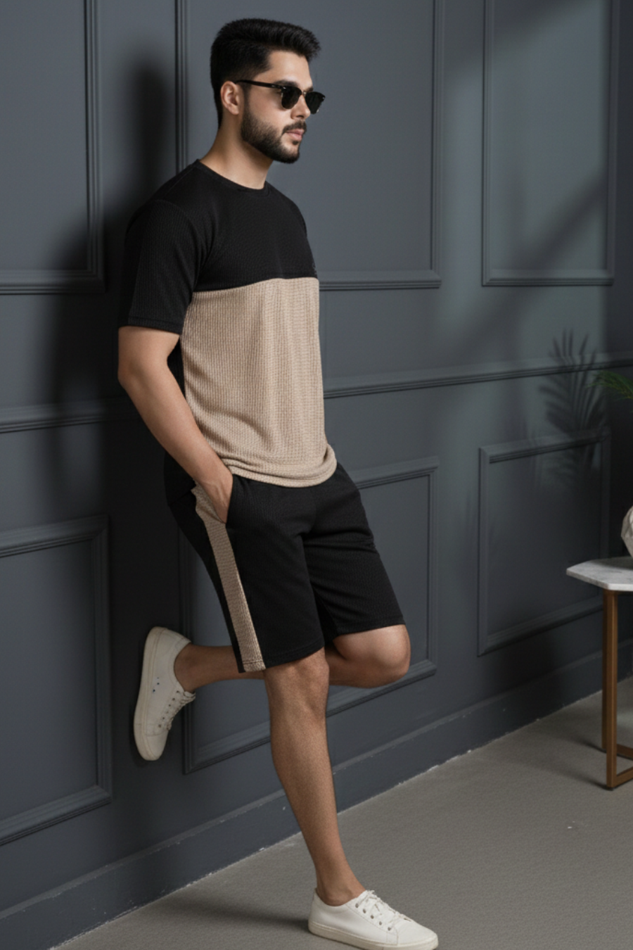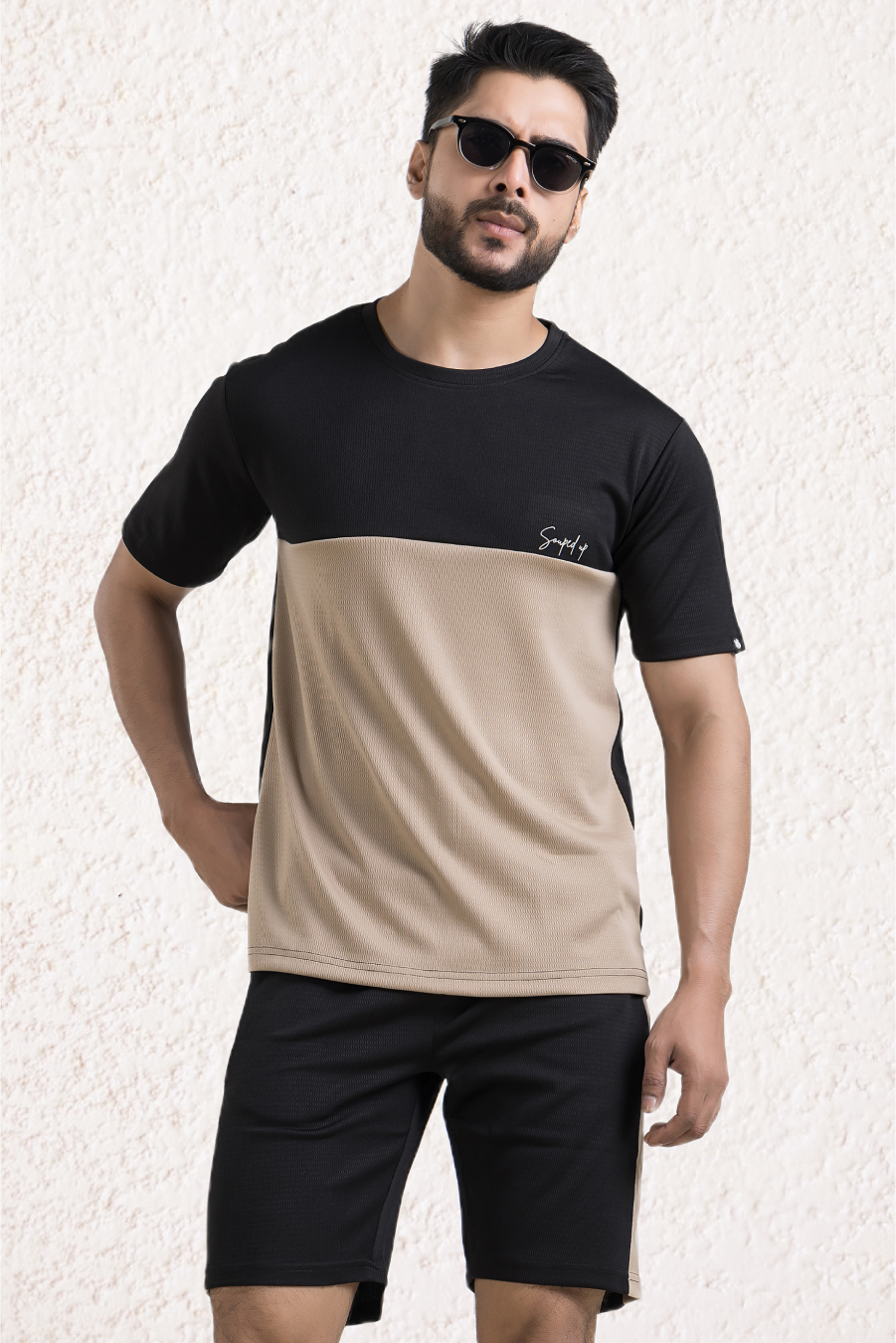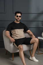 Essence Black & Beige Half Sleeves Tee & Shorts Co-Ord Set