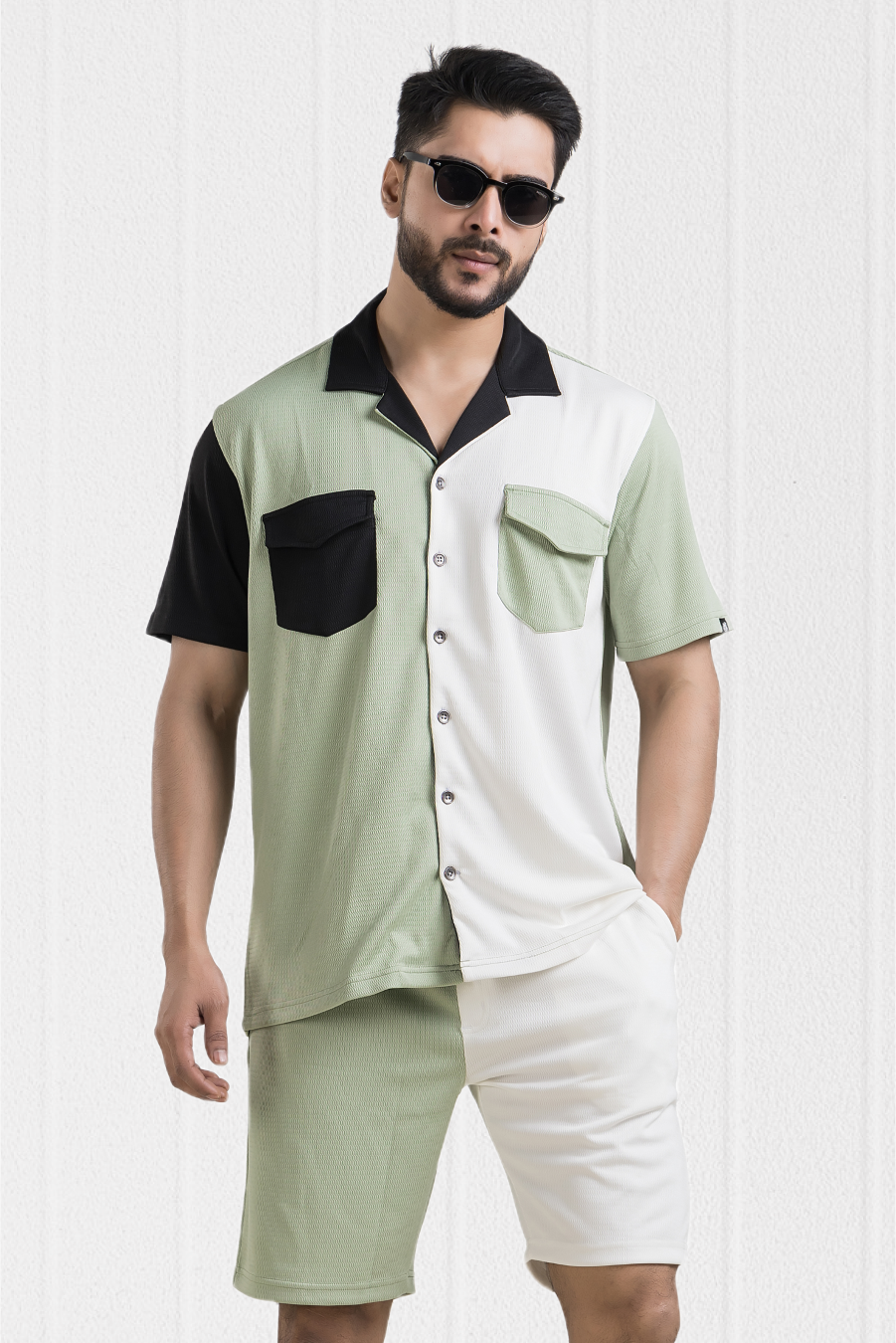 Unleash effortless sophistication with this co-ord set designed to turn heads. Featuring a half-sleeve shirt with a bold Cuban collar and two utility-style front pockets, it’s the perfect blend of chic and functional. The dual-tone design in mint green and white adds a refreshing twist, making it an ideal pick for fashion-forward men.
