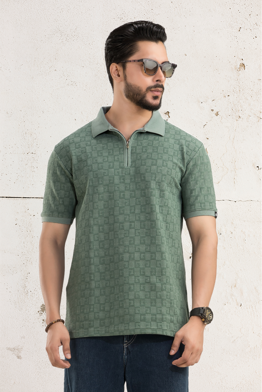 The half sleeves offer a timeless look, while the knitted collar, cuffs, and placket add a touch of sophistication. What sets this Polo apart is its distinctive metal zipper closure, giving it a sleek, modern edge.