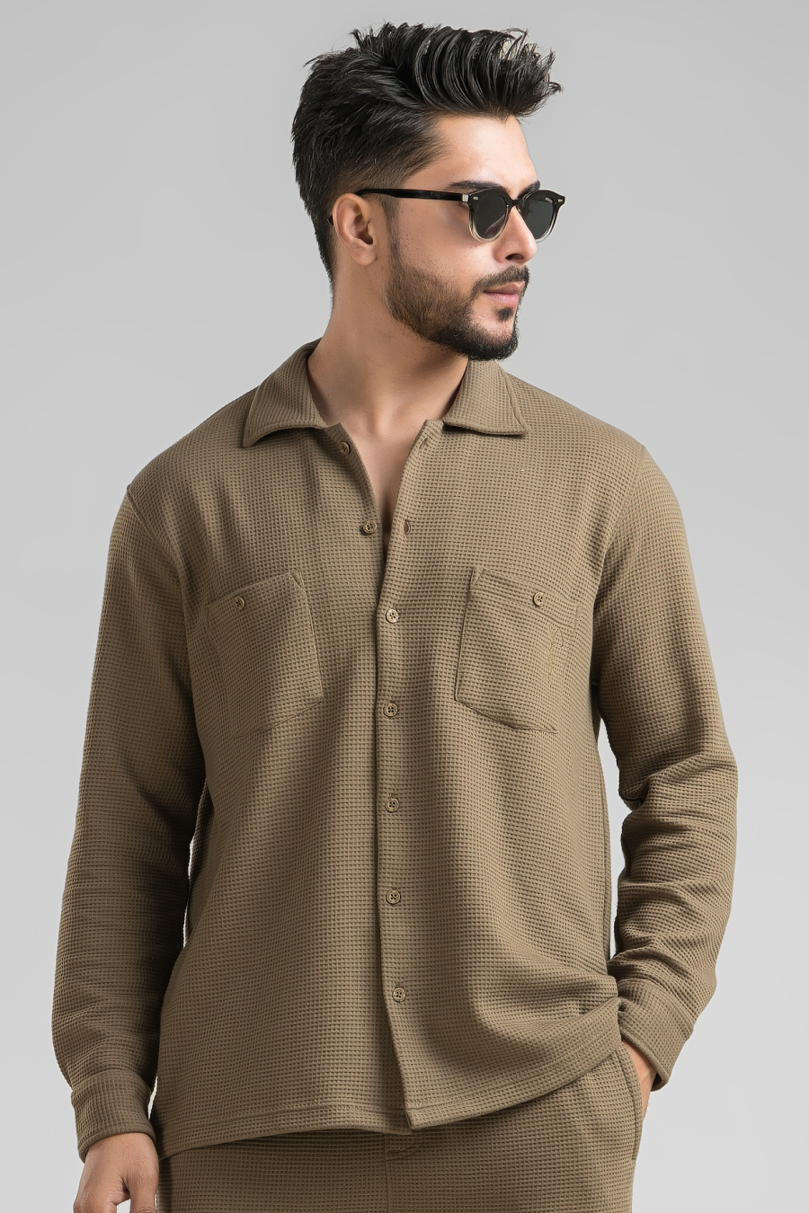 Haven Dark Olive Full Sleeves Waffle Knit Shacket