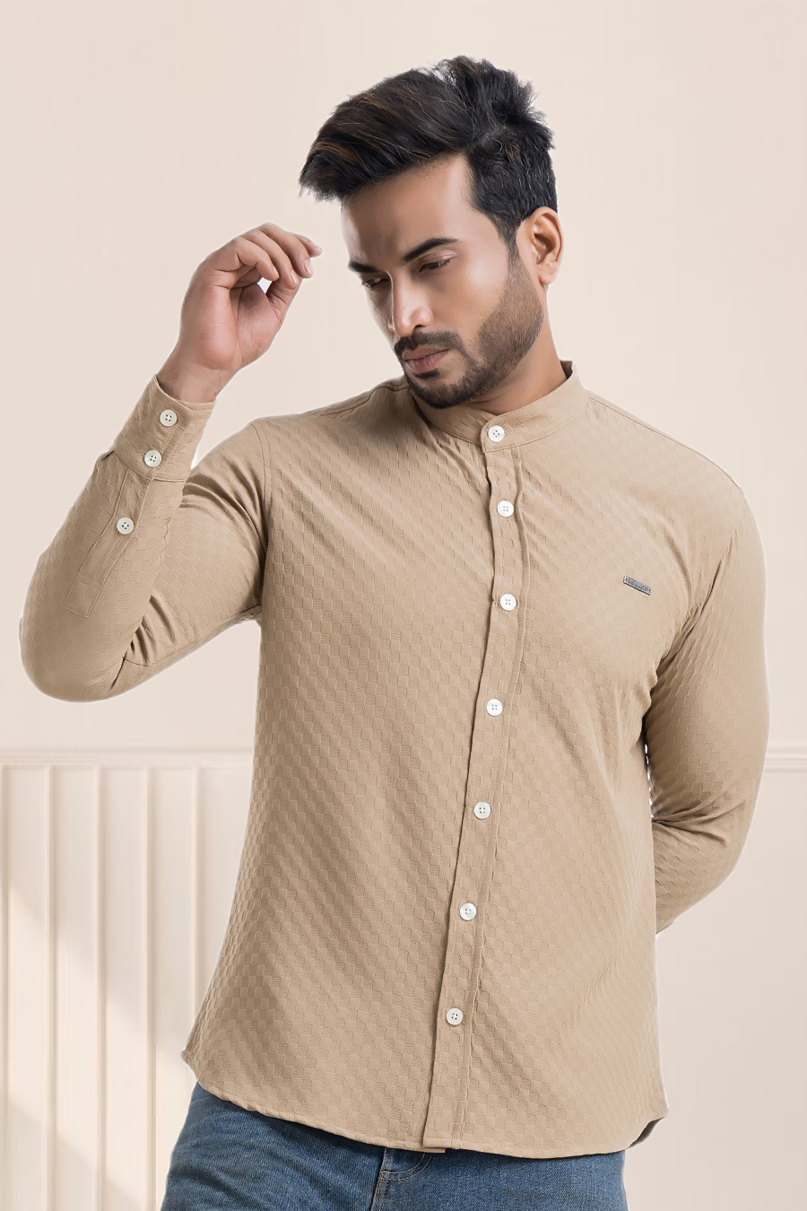Simplicity meets sophistication with this full-sleeve textured Mandarin collar shirt. Designed for the modern man who values versatility, this minimalistic shirt effortlessly transitions from casual hangouts to formal meetings. The lightweight, textured fabric provides all-day comfort, while the sleek Mandarin collar and cuffed sleeves add a refined edge.