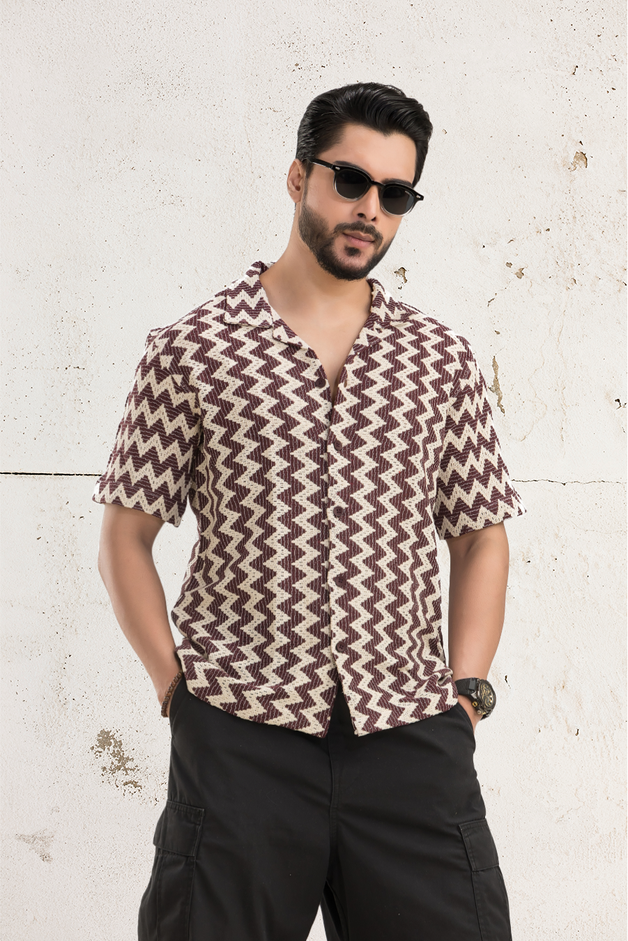 Zigzag Flair Maroon Cuban Collar Cotton Jacquard Shirt